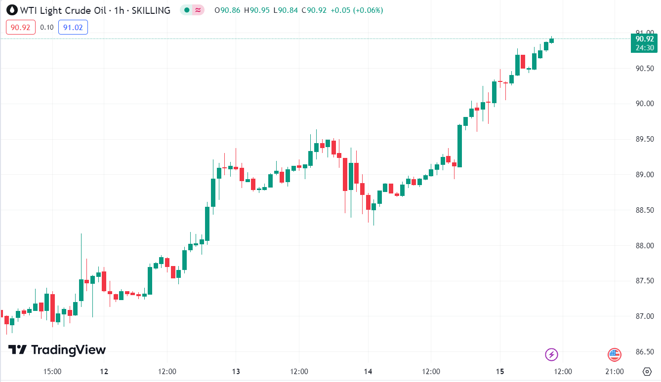 Với thị trường hàng hóa, dầu thô đã quay đầu giảm xuống dưới $90.50/thùng sau khi chạm mức cao nhất trong ngày (tính đến thời điểm hiện tại) là hơn $91/thùng. Dầu thô tăng cao hơn sẽ tiếp tục làm dấy lên những lo ngại về việc gia tăng áp lực lạm phát.