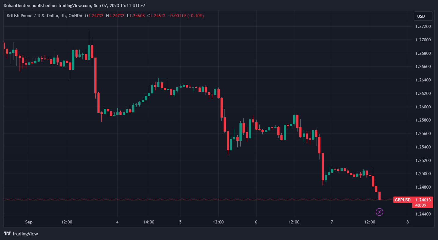 Trên khung D1, GBP/USD hiện đã -0.3% xuống mức đáy trong 3 tháng qua, tại 1.2467 và mục tiêu tiếp theo là đường MA 200 ngày (đường màu xanh) tại 1.2423. Tại khu vực đồng Euro, EUR/USD hiện đang giảm nhẹ 0.15% xuống 1.0711, trong khi USD/JPY biến động trong biên độ hẹp, giảm khoảng 0.12% xuống 147.48.