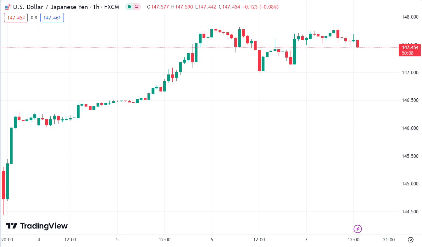 USD/JPY giao dịch trên 147.85, mức cao nhất trong 10 tháng trước khi quay trở lại dưới mức 147.60.
