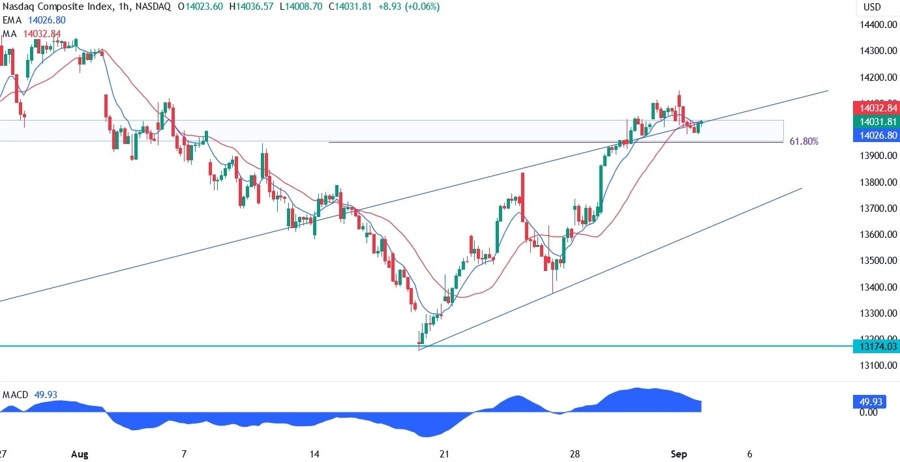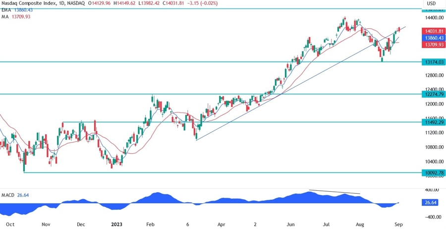 Trên khung ngày, Nasdaq Composite đã bật lên mạnh mẽ trên mức hỗ trợ quan trọng 13,174 và thoái lui để kiểm tra trendline bị phá vỡ. Giá hiện đang gặp khó khăn một chút tại khu vực xung quanh trendline, nhưng xu hướng đã chuyển sang tăng do giá đã hình thành các đỉnh cao hơn và đáy cao hơn, các đường MA cũng đã vượt lên phía trên.
