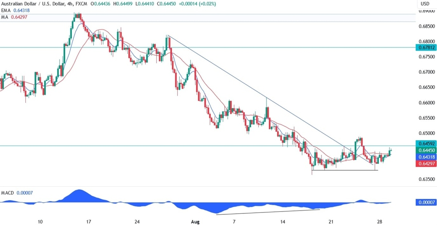 Trên khung 4 giờ, giá và chỉ báo MACD có sự phân kì và rơi xuống mức thấp. Cùng với đó, đường trendline đã bị phá vỡ, làm tăng cơ hội đảo chiều và cặp tiền bắt đầu nằm trong khoảng từ mức hỗ trợ 0.6380 đến mức kháng cự 0.6459. Phe bán có thể sẽ tập trung xung quanh ngưỡng kháng cự với rủi ro được xác định trên mức này để nhắm mục tiêu mức đáy mới thấp hơn, trong khi người mua sẽ muốn thấy sự bứt phá lên phía trên để bắt đầu nhắm mục tiêu tại 0.66.