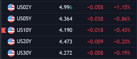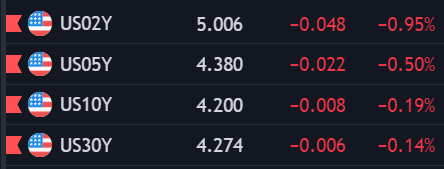 Hiện tại, hợp đồng tương lai của Mỹ đang tăng nhẹ và điều đó cũng đang giúp ích cho hợp đồng tương lai S&P 500 tăng 10 điểm, tương đương 0.24% trong ngày. Trong khi đó, lãi suất trái phiếu kho bạc giảm với lãi suất kỳ hạn 10 năm giảm 2.6 điểm cơ bản xuống 4.186%.