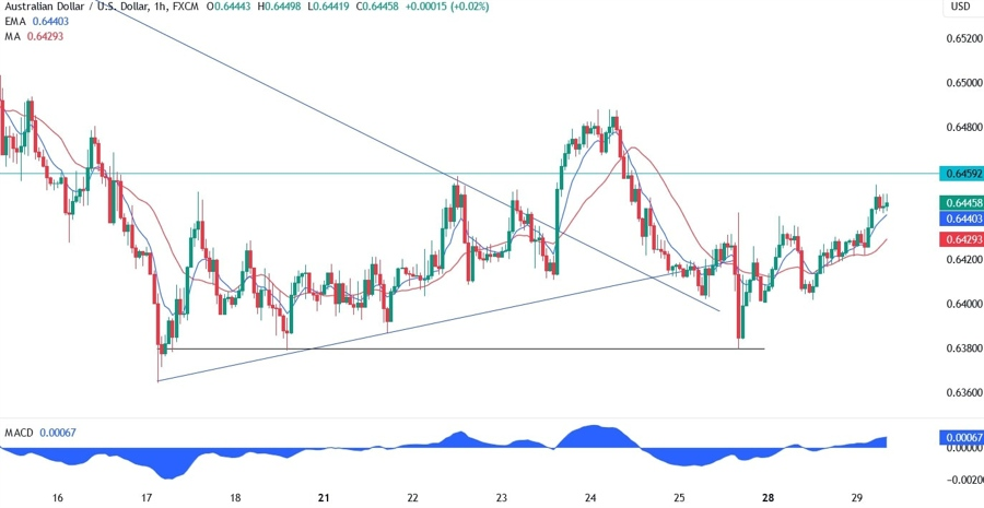 Trên khung 1 giờ, chúng ta có thể chú ý tới khu vực dưới mốc quan trọng 0.6459. Các mức này sẽ cần được lưu ý vì bất kì sự đột phá nào cũng tác động tới cặp tiền.