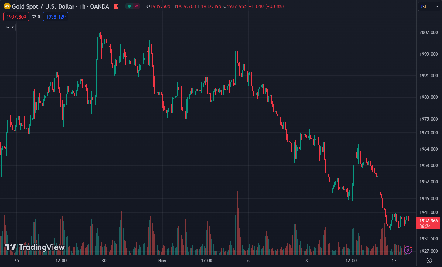 Giá vàng (XAU/USD) đã giảm xuống mức khoảng $1,940 và phải đối mặt với áp lực giảm giá đến từ nhiều yếu tố. Kim loại quý này đã mất đi sự hấp dẫn do không có sự leo thang đáng kể nào trong căng thẳng Trung Đông cùng với những quan điểm từ quan chức Fed, cũng như tâm lý thị trường trước dữ liệu chỉ số CPI Mỹ tháng 10 được công bố vào ngày mai.