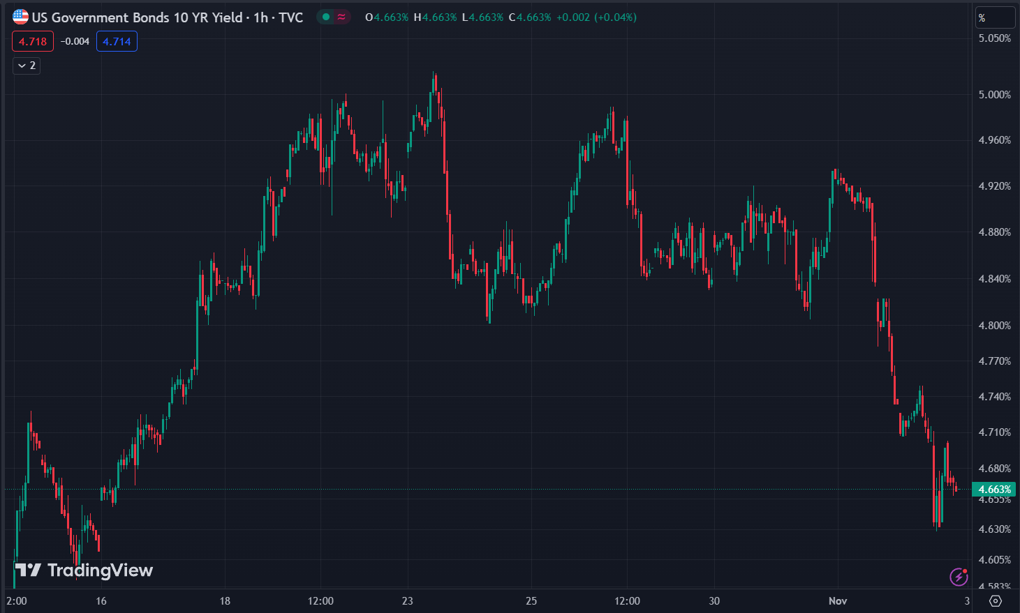 Thị trường trái phiếu đang là động lực chính cho tâm lý nhà đầu tư, vì đà giảm của lợi suất tiếp tục ảnh hưởng đến các tài sản khác kể từ sau cuộc họp của Fed vào thứ Tư. Lợi suất trái phiếu kho bạc kỳ hạn 10 năm đã giảm từ 5% xuống còn 4.65% khiến đồng đô la trượt dốc và cổ phiếu tăng giá. Câu hỏi được đặt ra là, liệu số liệu NFP có còn quan trọng hay không?