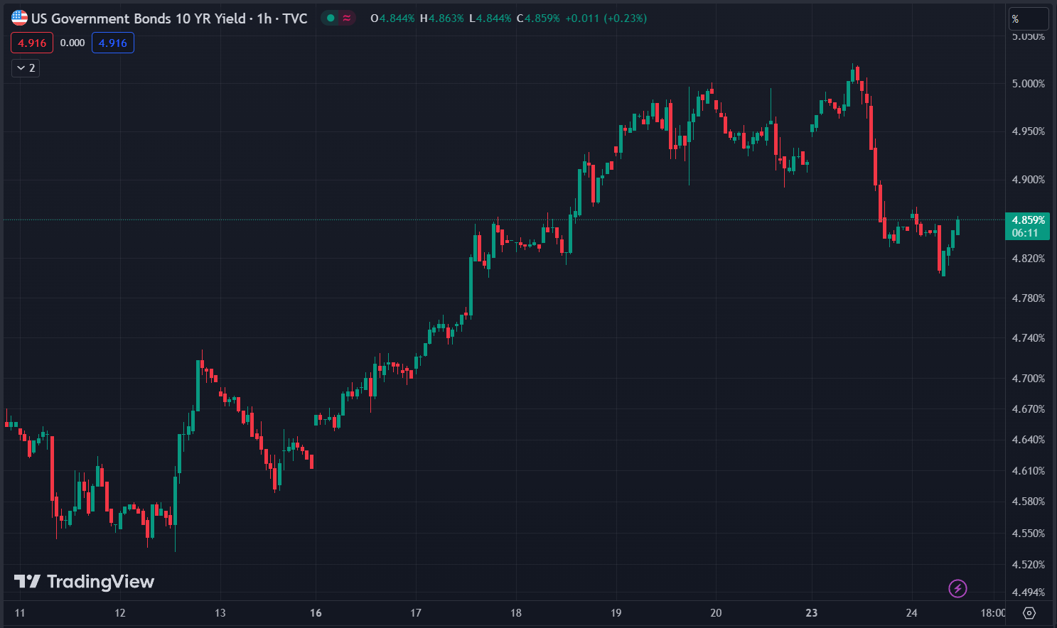 Lợi suất trái phiếu 10 năm của Mỹ tăng 0.024% lên 4.861%