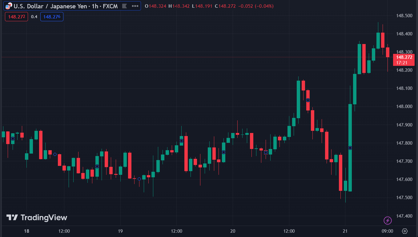 USDJPY giảm 0.05% trong ngày, hiện ở 148.27