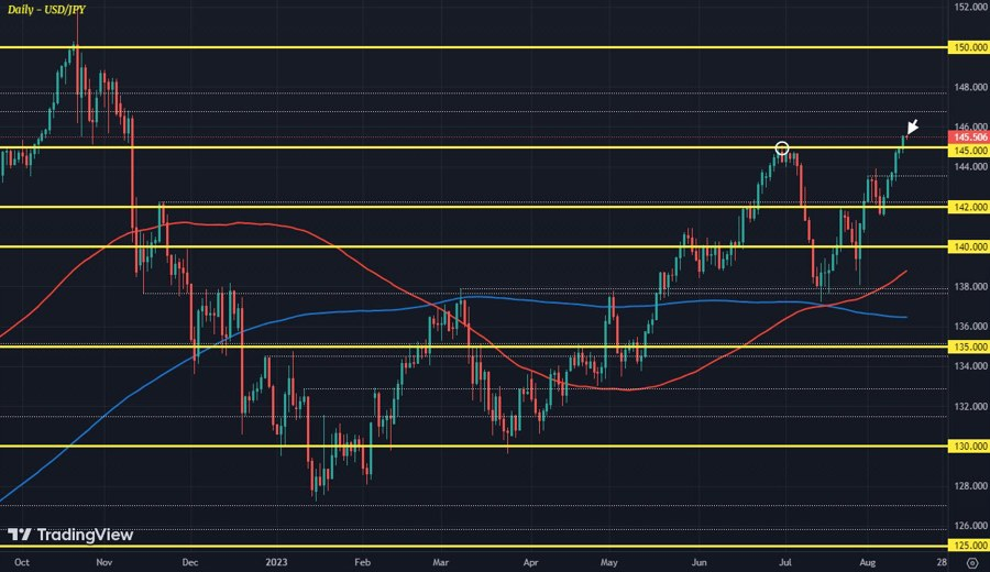 USD đang có xu hướng mở rộng đà tăng từ các mốc gần đây. Đáng chú ý, USD/JPY đang có động thái tăng trên ngưỡng 145 và cách mức 150 mộc khoảng. Câu hỏi được đặt ra ở đây là liệu chúng ta có nhìn thấy các động thái can thiện ngầm từ quan chức Nhật Bản.