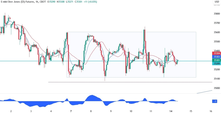 Trên biểu đồ ngày, trong khi đang tiến về ngưỡng kháng cự quan trọng tại 14,649, phân kỳ giá và MACD cho thấy chỉ số Nasdaq cho thấy tín hiệu đảo chiều. Giá có khả năng đi ngược xu hướng chính trong ngắn hạn khi người mua nhắm mục tiêu tại mức kháng cự 14,649. Nếu thành công, giá sẽ đảo chiều tăng do người bán tích cực mua vào để bán táo tại mức hỗ trợ 13,174.