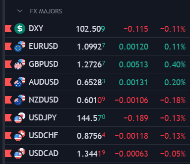 Trên thị trường FX, USD bật tăng mạnh mẽ sau tin PPI. Đồng bạc xanh cũng được hưởng lợi nhờ đà tăng của lợi suất trái phiếu kho bạc. GBP kết thúc phiên với tư cách là đồng tiền mạnh nhất, NZD yếu nhất trong nhóm tiền tệ chính. USD/JPY tăng chạm mức 145.00 nhưng không thể vượt qua mức đỉnh trong tháng 6 là 145.07. GBP tăng nhẹ nhưng yếu hơn so với hôm thứ 5 do đà phục hồi của USD. GBPUSD tăng 0.13% trong ngày, kết phiên ở 1.2678. NZDUSD giảm 0.65% xuống 0.5979.