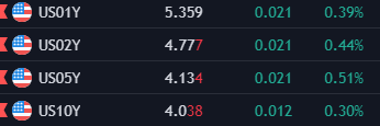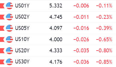 Giá dầu thô đạt mức cao nhất kể từ tháng 11. Dầu thô WTI tăng 1.30 USD hay 1.56%, kết phiên ở 84.21 USD. Vàng giảm 9.32 USD hay -0.48% xuống 1,915.52 USD. Bạc giảm 0.09 USD, tương đương -0.42% xuống 22.66 USD. Bitcoin bật tăng lên 30,119 USD trước khi quay trở lại và kết phiên ở mức 29,423 USD. Lợi suất trái phiếu kho bạc biến động trái chiều. Trong khi lợi suất trái phiếu ngắn hạn tăng nhẹ, lợi suất trái phiếu trung hạn và dài hạn tiếp tục giảm. Lợi suất kỳ hạn 2 năm tăng 4.2 bps, kết phiên ở 4.799% trong khi lợi suất kỳ hạn 10 năm giảm 1.8 bps xuống 4.008%.