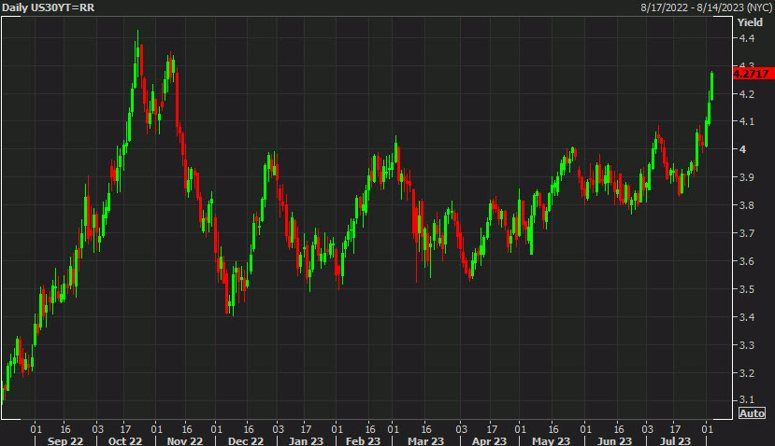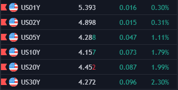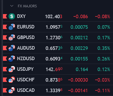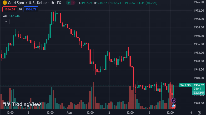 USD gần như đi ngang trong phạm vi từ $1930 - $1938/oz trong ngày dù lợi suất dài hạn tăng cao. Vàng kết phiên ở gần mức mở cửa trong ngày tại $1933.71/oz. Trên thị trường nợ, lợi suất 2 năm và 10 năm lần lượt tăng 0.2bp và 9.7bp lên 4.885% và 4.181%. Dầu WTI đóng cửa tăng hơn $2 lên $81.55/thùng trước tin tức Ả Rập Saudi cũng tuyên bố sẽ tiếp tục gia hạn việc cắt giảm sản lượng 1 triệu thùng mỗi ngày trong tháng 9. Đây phiên tăng mạnh nhất của dầu thô trong ba tuần trở lại đây, sau pha phục hồi mạnh mẽ từ mức giảm sâu phiên thứ Tư. Dầu WTI đóng cửa tăng hơn $2 lên $81.55/thùng. Bitcoin đóng cửa đi ngang quanh 29.2K, sau khi điều chỉnh tăng từ đáy ngày tại 29K đầu phiên u lên mức đỉnh ngày gần 29.5K trong phiên Mỹ.