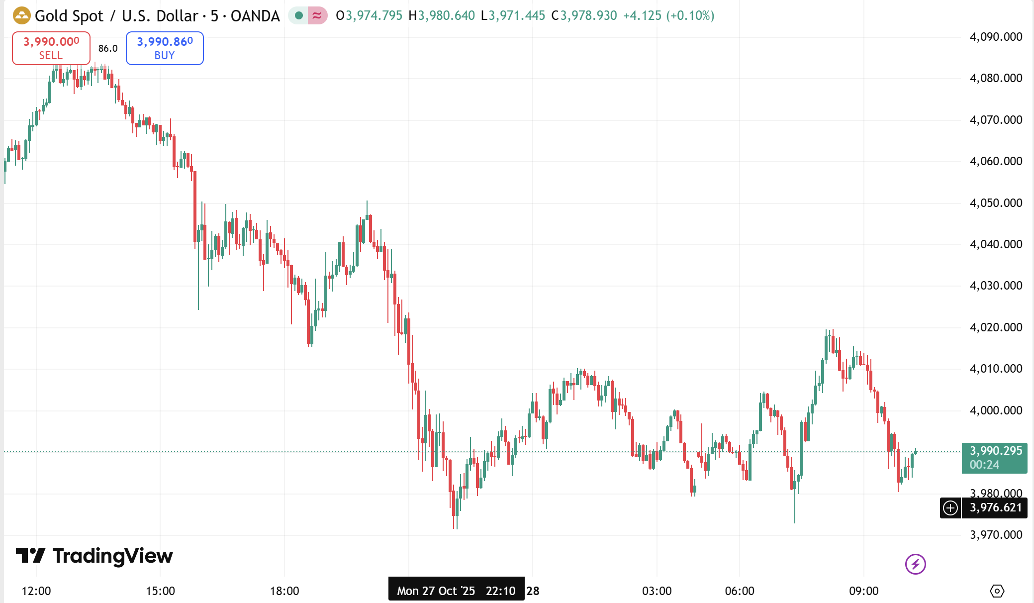 Trong khi đó, giá vàng giảm hơn 2%, có lúc giảm dưới ngưỡng 4,000 USD/oz xuống mức thấp nhất trong hai tuần, chịu áp lực bán chốt lời mạnh sau chuỗi tăng kéo dài hai tháng qua, do nhu cầu trú ẩn giảm bớt. Lợi suất trái phiếu Kho bạc Mỹ kỳ hạn 10 năm tăng 2.3 điểm cơ bản lên 4.02%, khi tâm lý rủi ro cải thiện nhờ triển vọng thỏa thuận thương mại Mỹ – Trung.