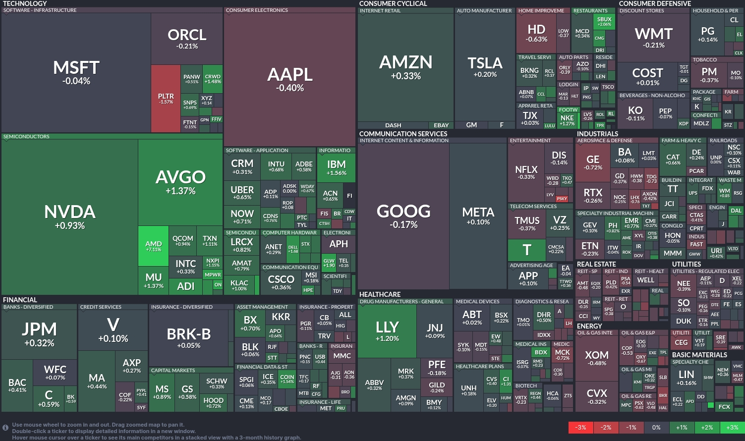 Bản đồ nhiệt thị trường chứng khoán hôm nay vẽ nên một bức tranh đa dạng với các ngành thể hiện những con đường khác nhau. Ngành công nghệ cho thấy một sự nhích lên nhẹ, được thúc đẩy bởi mức tăng của các cổ phiếu bán dẫn. AMD dẫn đầu với mức tăng 7.11%, và NVDA đóng góp mức tăng 0.9%, cho thấy niềm tin của nhà đầu tư vào các nhà sản xuất chip bất chấp những lo ngại rộng lớn hơn.