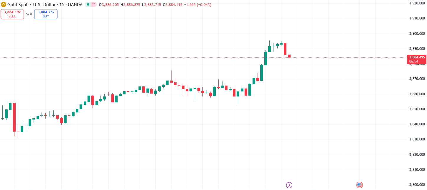 Giá vàng điều chỉnh về 3,884 USD/oz sau khi lập đỉnh mới trên mức 3,890 USD/oz