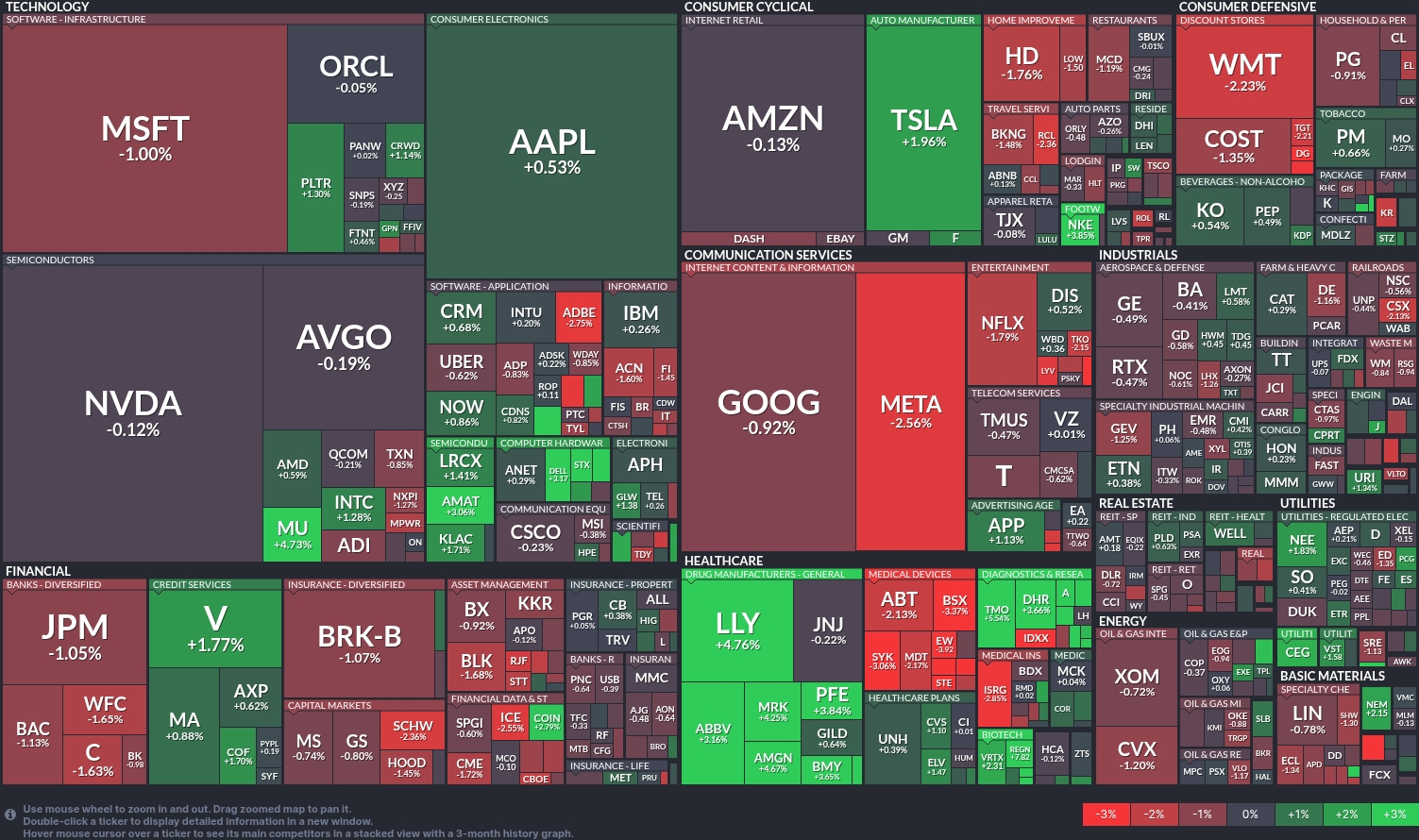 Ngược lại, các ngành Hàng tiêu dùng Chu kỳ và Dịch vụ Truyền thông cho thấy những tổn thất đáng kể, với Tesla (TSLA) là một ngoại lệ khi tăng 1.96%. Google (GOOG) và Meta (META) đang trong sắc đỏ, giảm lần lượt 0.92% và 2.56%.