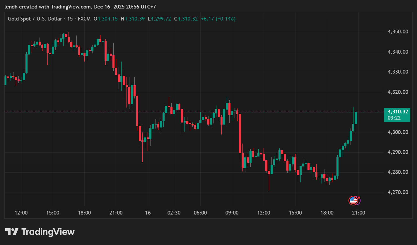 Giá vàng tăng nhẹ 0.17% lên mức 4,310 USD/ounce, khi nhà đầu tư tiêu hóa loạt dữ liệu kinh tế Mỹ mới công bố và cân nhắc các hàm ý đối với lộ trình chính sách của Fed trong năm tới. Lợi suất trái phiếu CP Mỹ biến động trái chiều trong ngày, với lợi suất kỳ hạn 10 năm kết phiên giảm nhẹ 3 điểm cơ bản xuống mức 4.15%