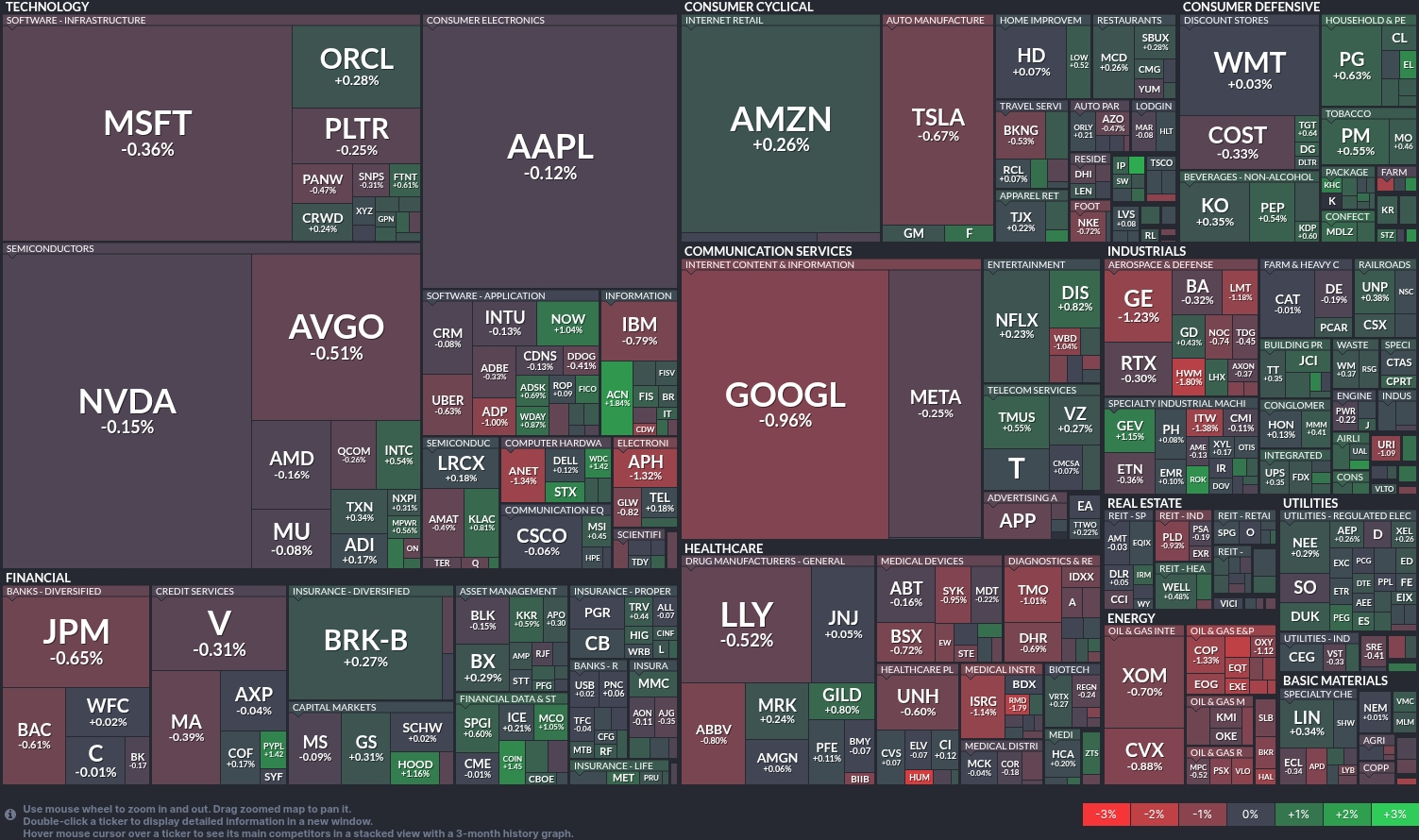 Ngành bán dẫn đang gặp khó khăn, được minh chứng bởi đà giảm của các công ty đầu ngành như Nvidia (NVDA) giảm 0.15% và Advanced Micro Devices (AMD) giảm 0.16%. Những biến động này cho thấy tâm lý thận trọng của nhà đầu tư đối với nhóm công nghệ, đặc biệt là các nhà sản xuất chip.