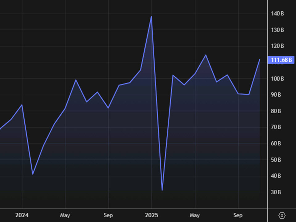 Cùng lúc, thặng dư tài khoản vãng lai tháng 10 đạt 2,833 nghìn tỷ yên, thấp hơn mức dự báo 3,109 nghìn tỷ yên và giảm so với 4,483 nghìn tỷ yên của tháng trước. Sự suy yếu này chủ yếu đến từ thu nhập đầu tư và thặng dư thương mại thấp hơn, phản ánh những khó khăn của nền kinh tế Nhật Bản trong bối cảnh đồng yên biến động mạnh và triển vọng xuất khẩu kém trước thềm cuộc họp chính sách của BOJ.