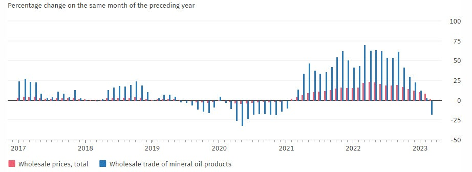 Giá bán buôn của Đức tăng nhẹ trong tháng nhưng mức thay đổi hàng năm lại sụt giảm mạnh, tương tự như những gì chúng ta thấy từ các con số lạm phát giá tiêu dùng. Điều này cũng được thể hiện rõ qua sự sụt giảm trong thương mại bán buôn các sản phẩm dầu khoáng - lần đầu tiên kể từ tháng 1 năm 2021.