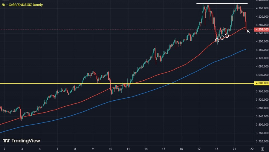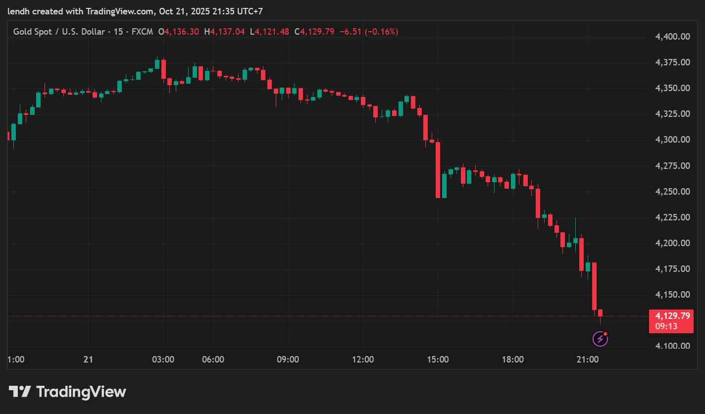 Vàng tiếp tục đà giảm xuống dưới mức 4,130 USD/oz, điều chỉnh mạnh mẽ trong phiên