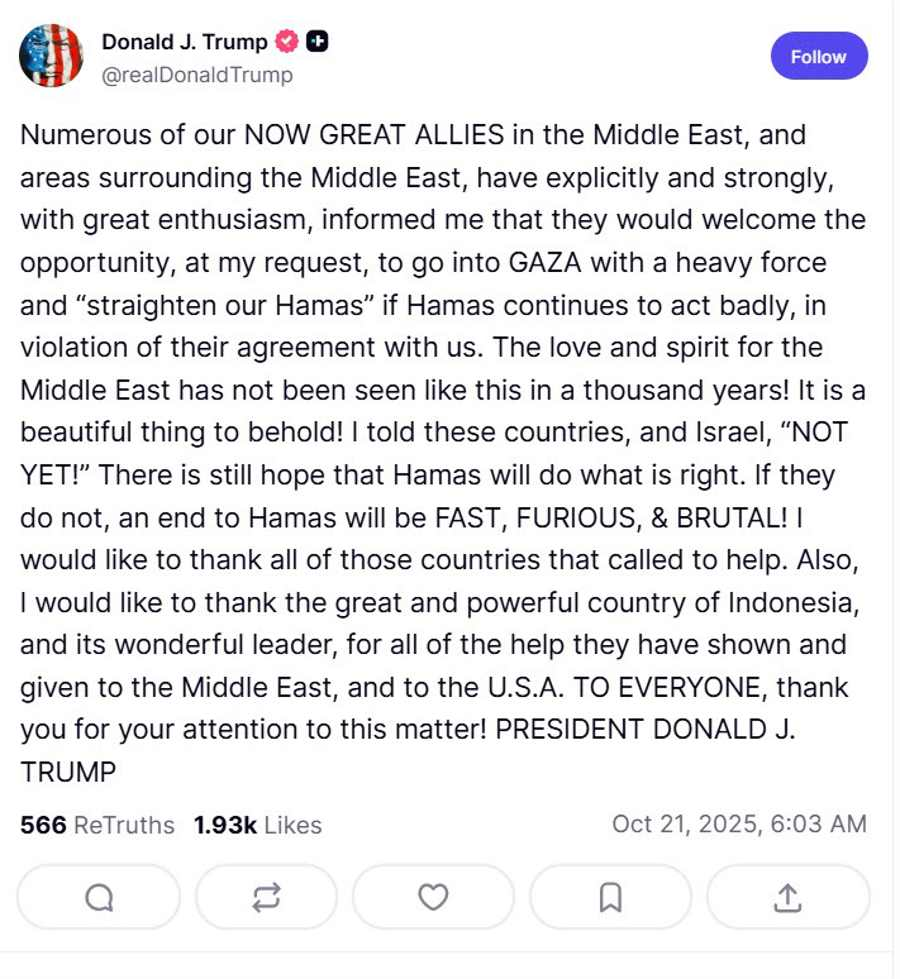 Tổng thống Trump đã đăng trên mạng xã hội Truth Social rằng nhiều đồng minh ở Trung Đông đang khuyến khích đưa lực lượng hùng hậu vào Gaza và "xử lý dứt điểm Hamas".