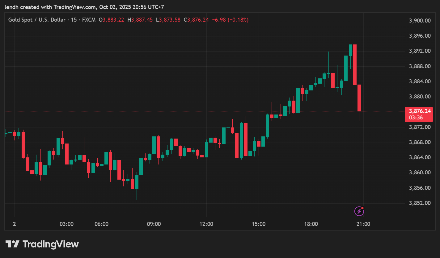 Giá vàng điều chỉnh về 3,884 USD/oz sau khi lập đỉnh mới trên mức 3,890 USD/oz