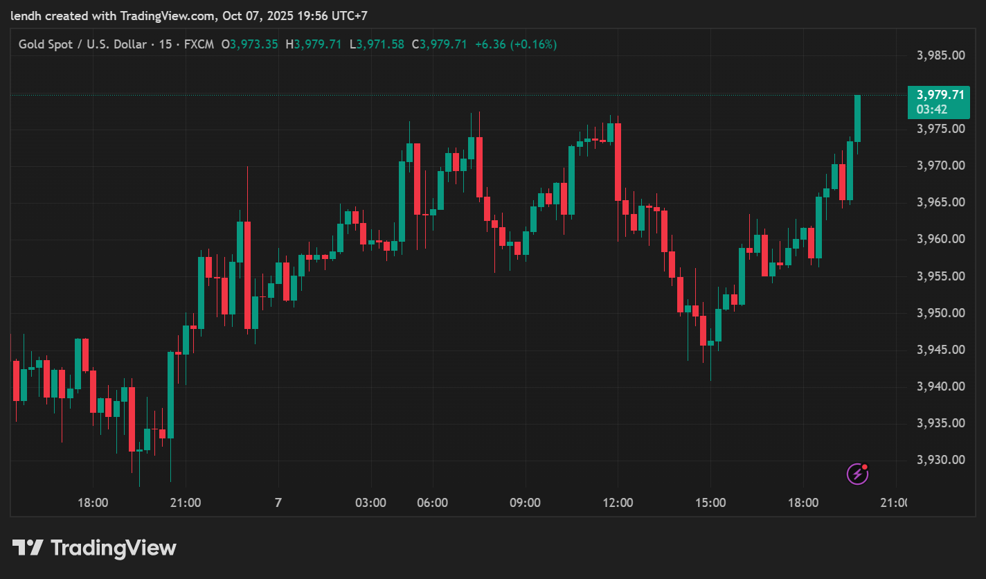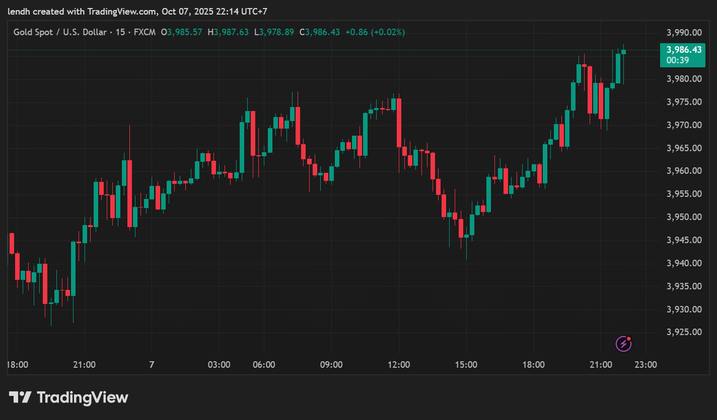 Vàng tiếp tục lập đỉnh lịch sử mới, giao dịch tại mức 3,986 USD/oz khi nhà đầu tư đổ xô tìm nơi trú ẩn an toàn giữa bối cảnh bất ổn chính trị leo thang tại Pháp, chính phủ Mỹ tiếp tục đóng cửa, và kỳ vọng Cục Dự trữ Liên bang (Fed) sẽ tiếp tục cắt giảm lãi suất gia tăng.