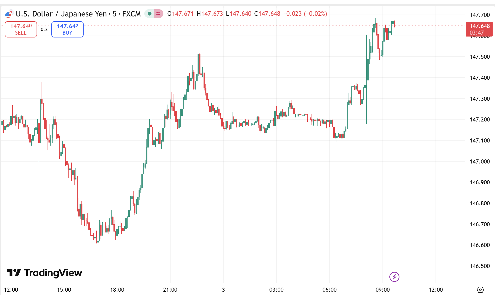 USD/JPY đã bật tăng sau phát biểu, nhưng chỉ dừng lại gần vùng kháng cự quanh 147.60.