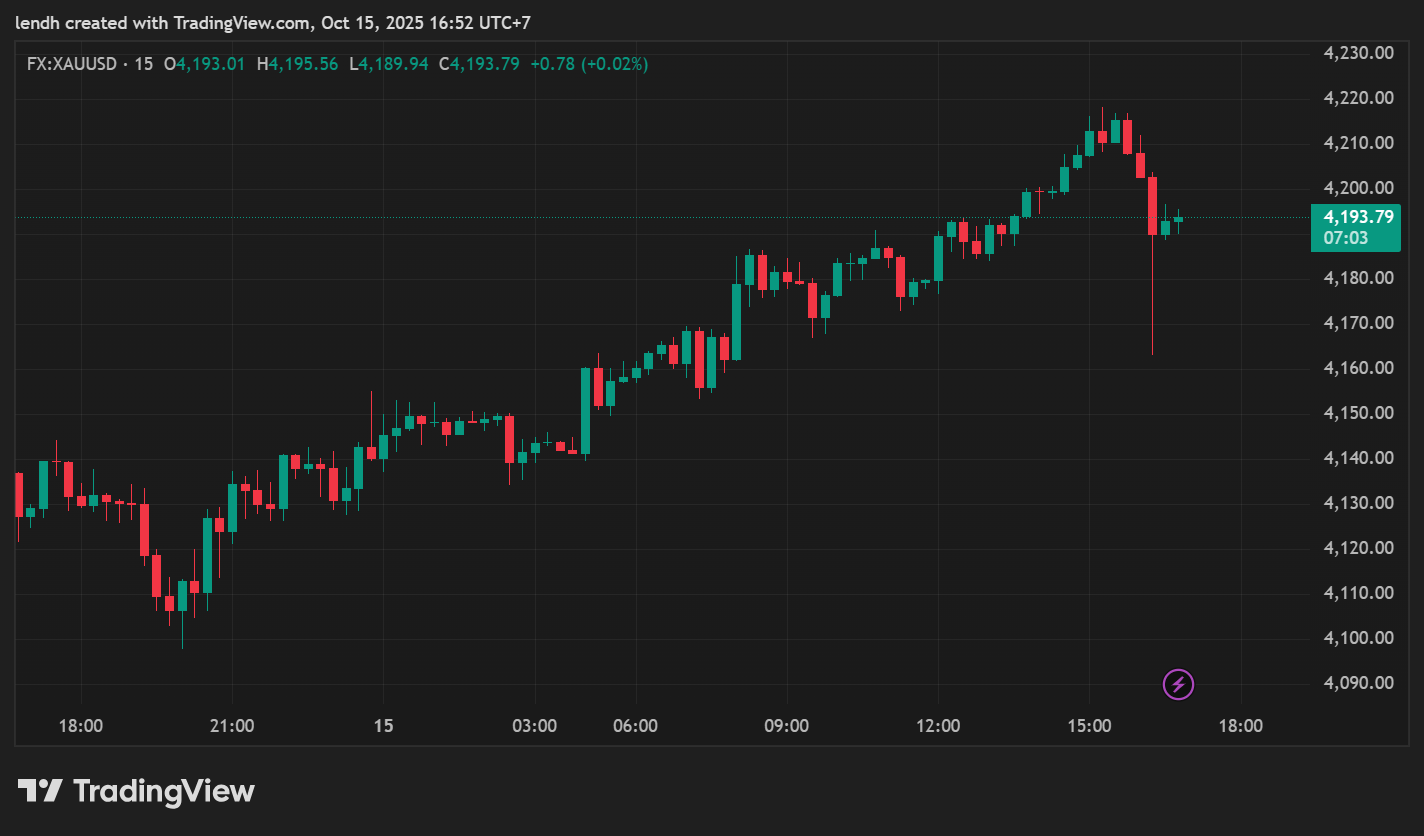 Giá vàng dao động quanh mức 4,193 USD/oz, điều chỉnh sau khi vượt đỉnh 4,200 USD/oz