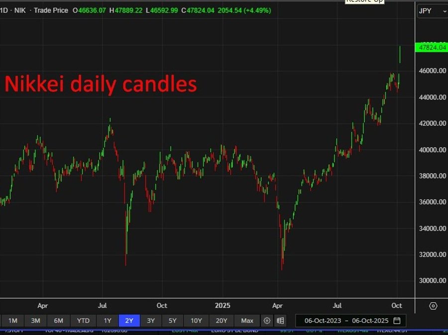 Tin lớn nhất cuối tuần đến từ Nhật Bản khi Sanae Takaichi giành chiến thắng trong cuộc bầu cử lãnh đạo Đảng Dân chủ Tự do (LDP), trở thành nữ Thủ tướng đầu tiên của Nhật Bản. Là người theo đường lối nới lỏng tài khóa (fiscal dove), bà Takaichi đã khiến thị trường phản ứng mạnh ngay đầu tuần.