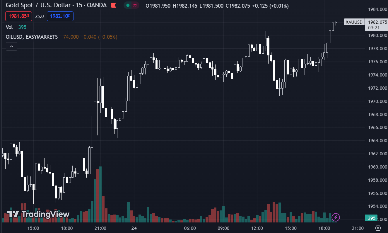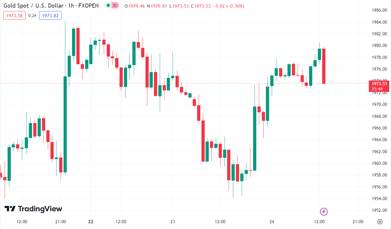Vàng hiện đảo chiều giảm trong phiên, dao động quanh mức $1,973.5.