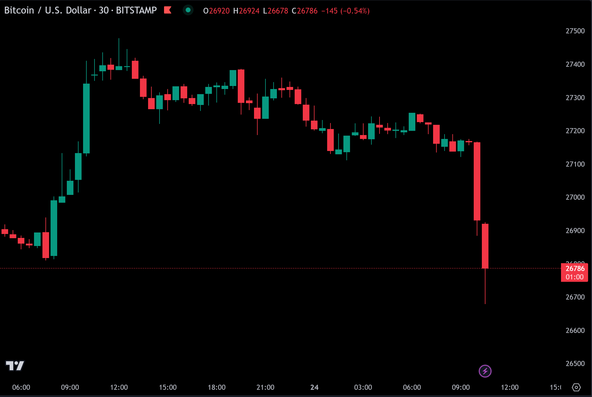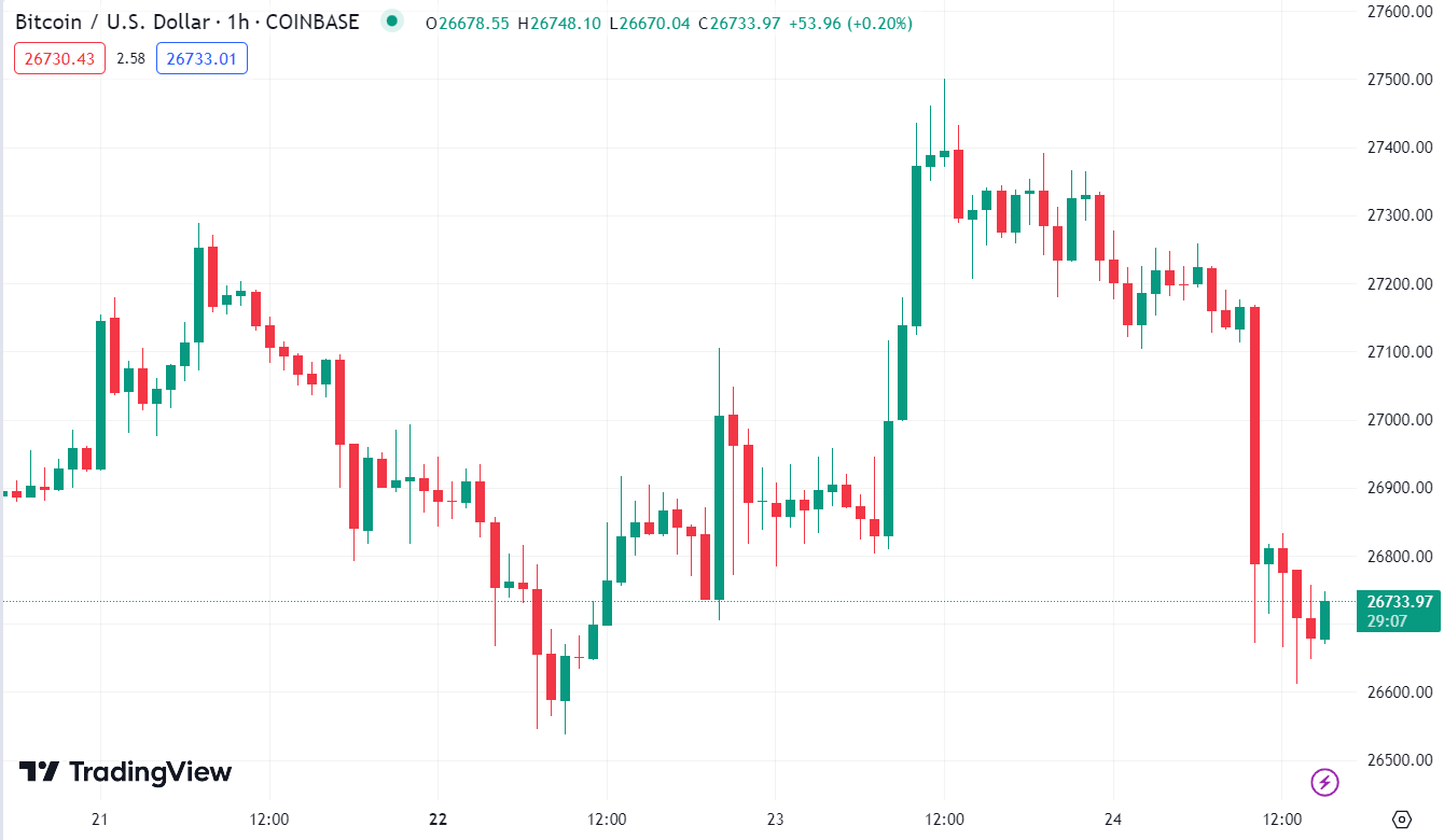 Bitcoin giảm mạnh, giằng co quanh $26,900