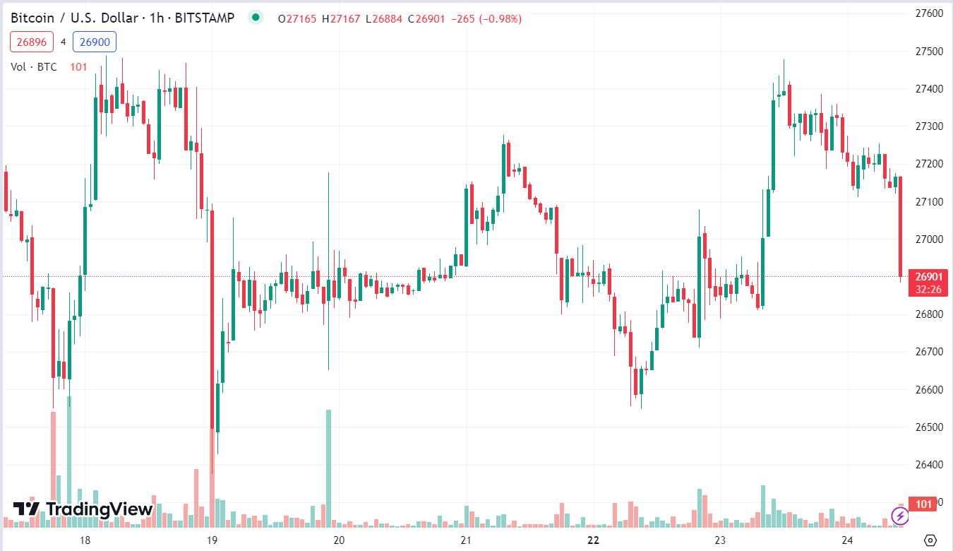 BTCUSD giảm 1.19% trong ngày, hiện ở %26,901