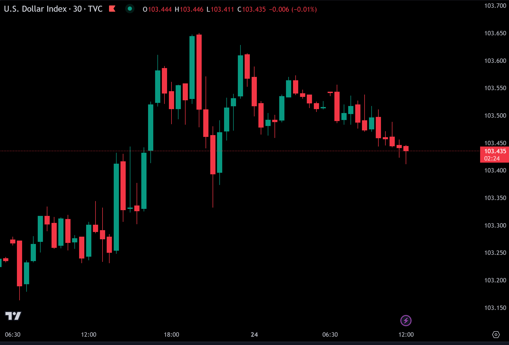 Thị trường diễn biến ảm đạm trong bối cảnh tình hình chính trị kinh tế thế giới bất ổn. Đồng bạc xanh giảm nhẹ, hiện đang ở trên mức 103.40. Bên cạnh đó, lợi suất TPCP Hoa Kỳ kỳ hạn trên 1 năm đồng loạt giảm. Chứng khoán châu Á cũng chìm trong sắc đỏ.