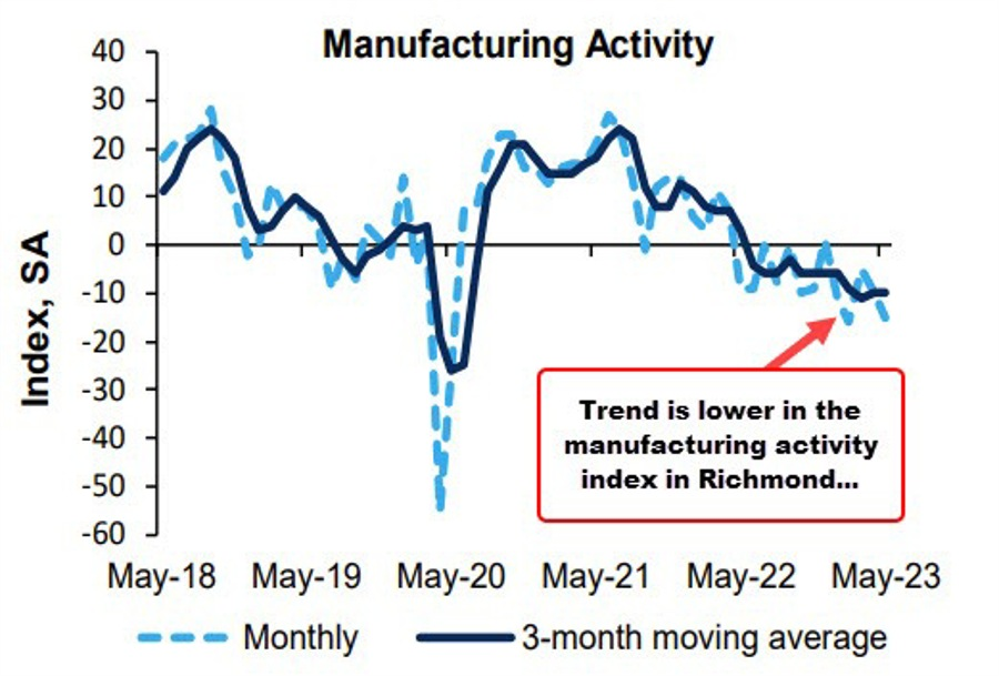 Trên thị trường FX, USD trượt giá sau các dữ liệu trái chiều trong phiên Mỹ: doanh số bán nhà tháng 4 vượt dự kiến nhưng giá bán trung bình đã giảm xuống. Sản xuất tiếp tục bị thu hẹp được phản ánh thông qua chỉ số sản xuất Richmond Fed thấp hơn kỳ vọng (-15 so với dự báo là -8) và PMI sơ bộ của S&P Global thấp hơn 50, chỉ đạt 48.5 điểm. Diễn biến tương tự cũng xuất hiện tại khu vực châu Âu, đặc biệt là Đức với 42.9 điểm - mức đáy trong gần 3 năm trở lại đây. Mặc dù PMI sơ bộ tại EU đã giảm xuống (từ 54.1 xuống 53.3) trong tháng 5, nhưng vẫn cao hơn mốc 50 - ranh giới giữa tăng trưởng và thu hẹp. GBP và EUR suy yếu đã hỗ trợ USD tăng và đẩy nhóm G7 giảm sâu đầu phiên Âu. Ngoài ra, nhận định “lạm phát đã đảo chiều” từ thống đốc BOE Bailey cũng đã gây áp lực đáng kể lên GBP. Chốt phiên USD tăng trên diện rộng, ngoại trừ với JPY và CAD kết phiên ở gần mức mở cửa trong ngày. USDJPY trong phiên Á đã thiết lập đỉnh mới từ đầu tháng 12 năm ngoái đến nay.