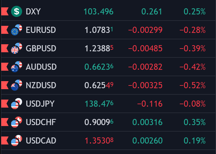 USD giảm đã hỗ trợ vàng phục hồi mạnh mẽ đầu phiên Mỹ từ dưới đáy $1955/oz lên gần $1975/oz (+$5.7 so với giá mở cửa trước đó). Thị trường nợ đóng cửa trái chiều sau pha trượt dài trong đêm. Kết phiên, lợi suất 2 năm +0.03bp lên 4.327% trong khi lợi suất 10 năm -2.3bp xuống 3.696%. Dầu thô +$0.86 lên $72.9/thùng - tăng tích cực từ đầu phiên u và trong đêm. BTC giảm nhẹ xuống vùng 27.2K sau khi bật tăng mạnh mẽ lên gần 27.5K đầu phiên Á.