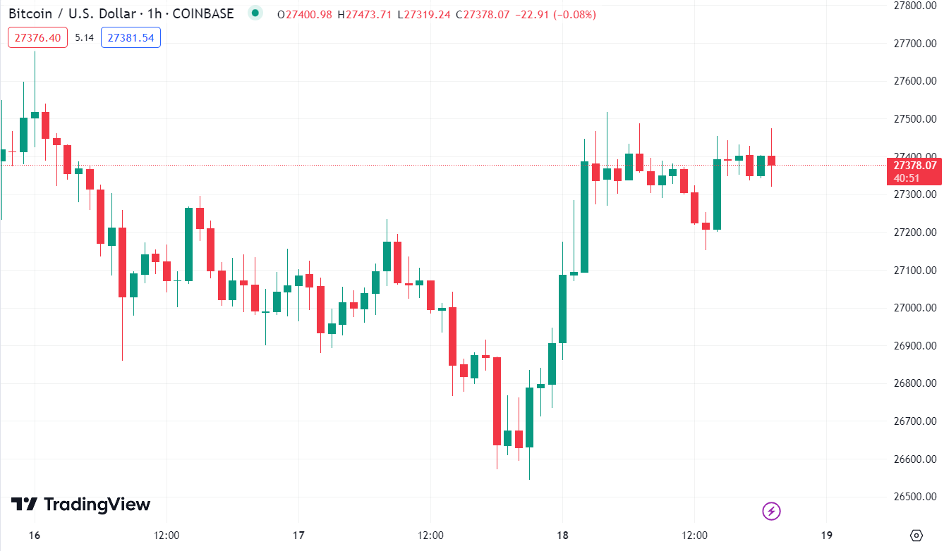 Bitcoin giảm nhẹ trong phiên Âu, hiện đang dao động quanh mức $27,378.