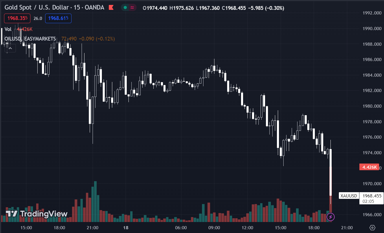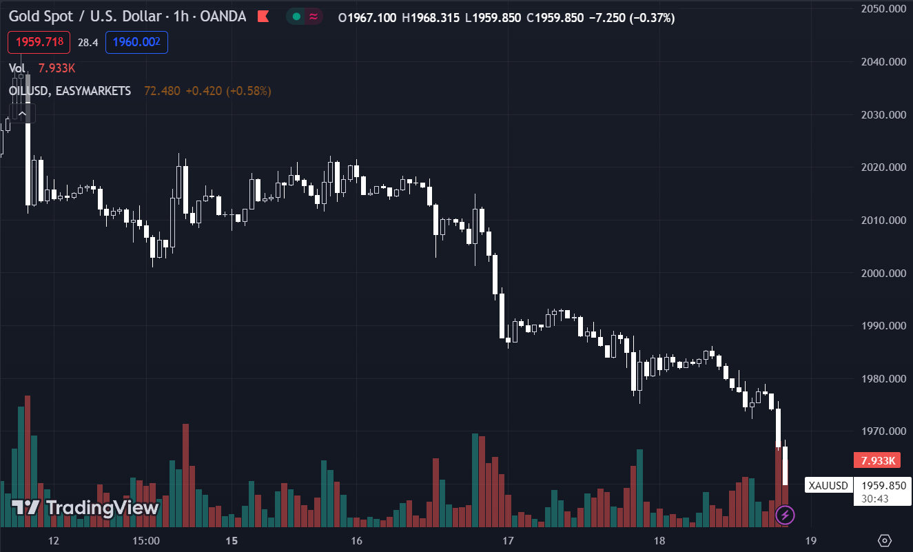 USD và lợi suất đồng loạt tăng đã gây áp lực khiến vàng -$23.45 xuống $1957/oz - mức thấp nhất trong hơn 1 tháng qua. Lợi suất 2 năm và 10 lần lượt +26.6bp và +18.1bp lên 4.26% và 3.651%. Dầu WTI chững lại đà giảm của hơn 4 ngày qua khi đóng cửa +$2.1 lên $72.14/thùng. Bitcoin trở lại vùng 26.8K sau khi chạm mốc 26.3K trong đêm.