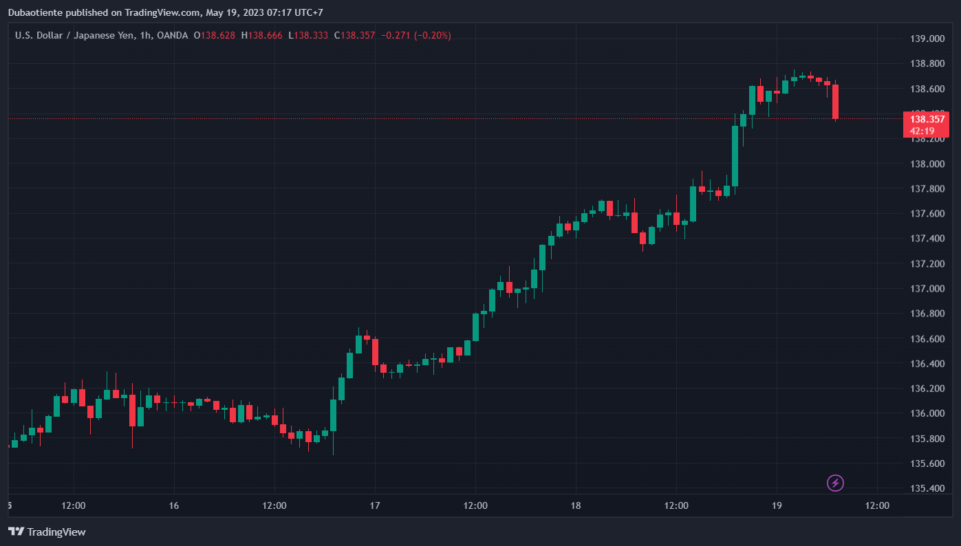 Trên thị trường FX, phát biểu của chủ tịch Fed Dallas Logan và các dữ liệu thấp hơn dự kiến trong phiên Mỹ đã hỗ trợ USD đóng cửa mạnh nhất trong số các đồng tiền chính: Số đơn xin trợ cấp thất nghiệp tuần này giảm xuống còn 242K so với dự báo 254K, Chỉ số sản xuất Philly tháng 5 -10.4 trước ước tính -19 điểm. NZD phục hồi mạnh mẽ trong đêm sau pha trượt giá đầu phiên Mỹ. USD tăng và báo cáo việc làm gây thất vọng trong tháng 4 tại Úc đã tạo áp lực kéo AUD trở lại vùng đáy tháng 5. Tỷ lệ thất nghiệp tăng lên 3.7% (trước đó là 3.5%) với lượng việc làm mới -4.3K so với dự báo +25K đã củng cố khả năng RBA tạm dừng tăng lãi suất trong tháng 6. JPY tiếp tục là đồng tiền yếu nhất trong nhóm G7. Đáng chú ý, cặp USDJPY trong ngày giao dịch thứ Năm đã thiết lập đỉnh mới từ đầu tháng 12 năm ngoái đến nay.