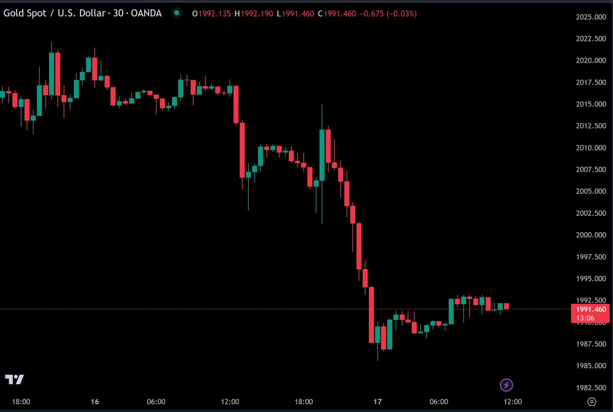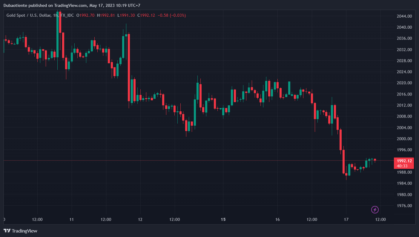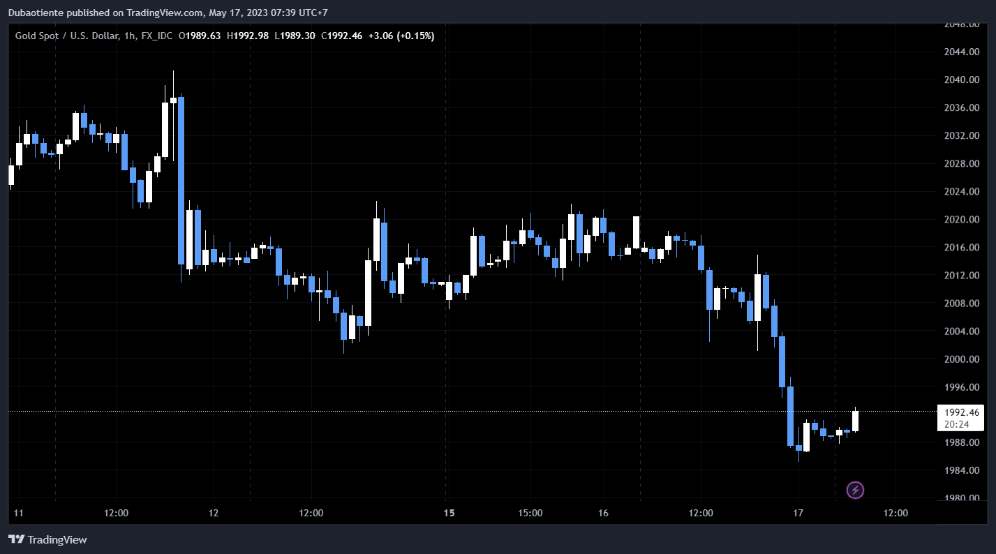 Vàng rơi xuống $1985/oz sau đà tăng nhờ báo cáo doanh số bán lẻ tháng 4 của Mỹ, trước áp lực phục hồi mạnh mẽ của TPCP. Kết phiên, vàng giảm $27.19 xuống $1988.24/oz. Lợi suất 2 năm và 10 lần lượt +7.1bp và +3.2bp lên 4.086% và 3.54%. Dầu thô đóng cửa -$0.25 xuống $70.86/thùng.
