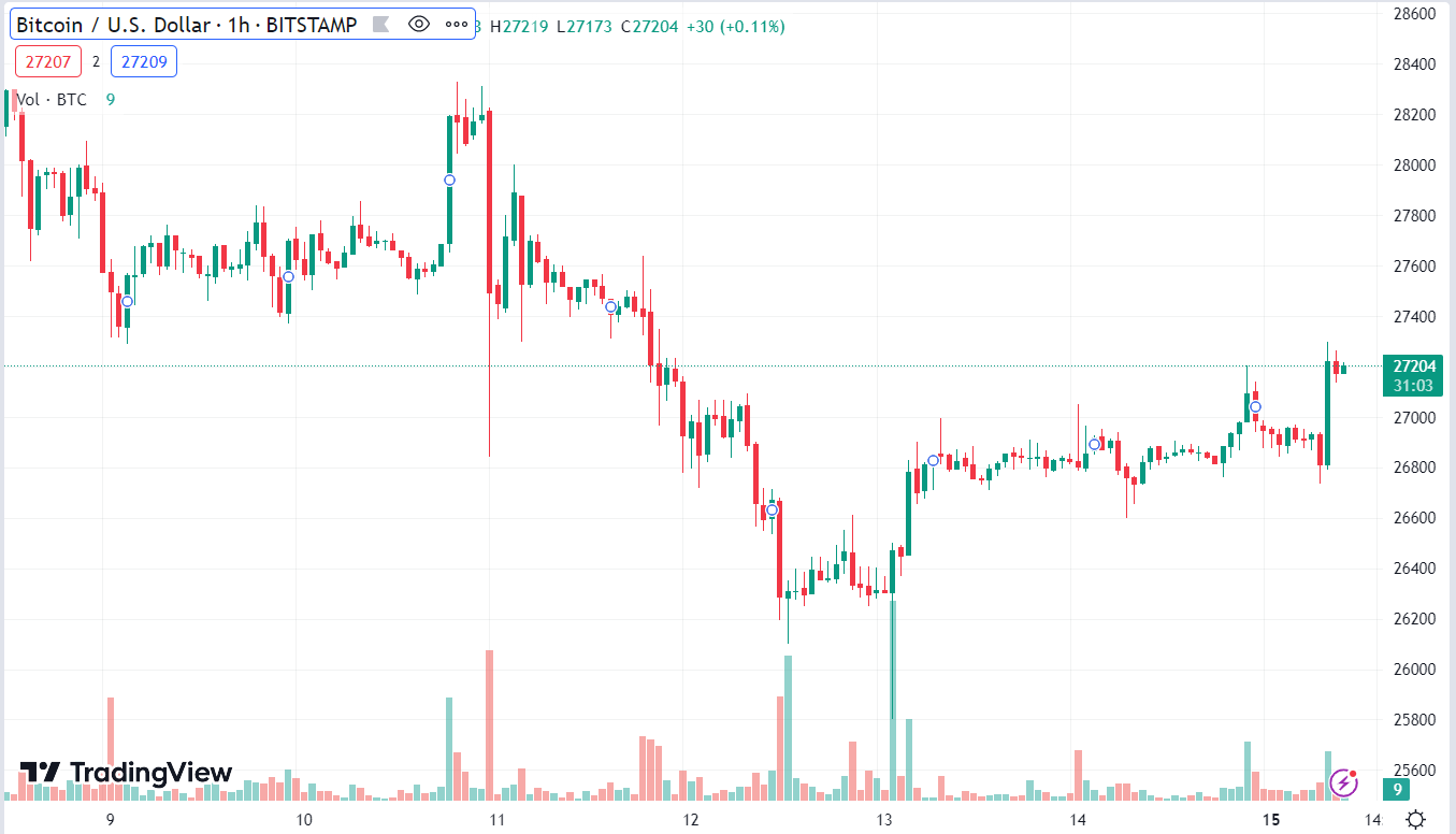 BTCUSD tăng 1.02% trong ngày, hiện ở $27,207