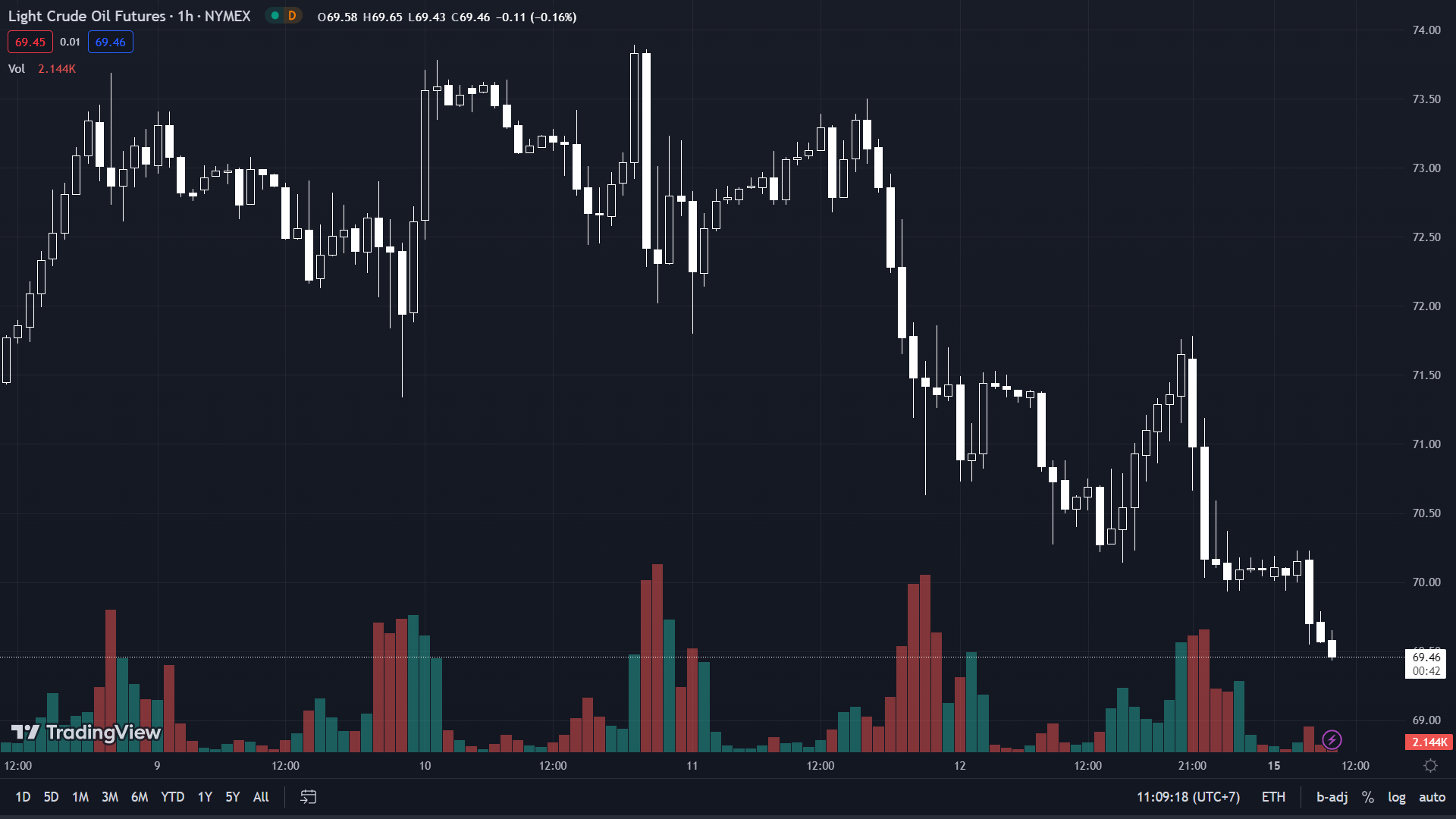 Dầu WTI tiếp tục giảm xuống 69.43 USD