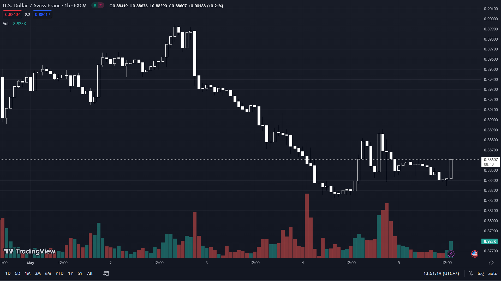 USD/CHF vẫn tăng sau tin CPI và hiện ở 0.88607.