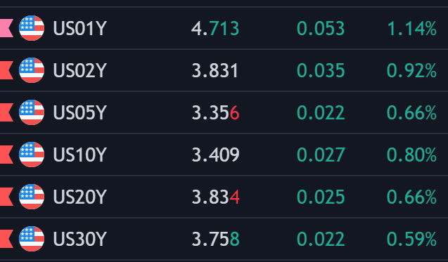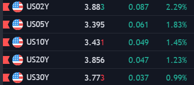 Lợi suất trái phiếu chính phủ Mỹ đồng loạt tăng trên khắp các kỳ hạn, trong khi đó đồng bạc xanh đang dao động trên mức 102.000