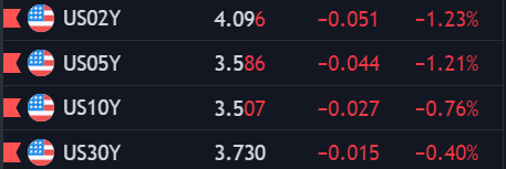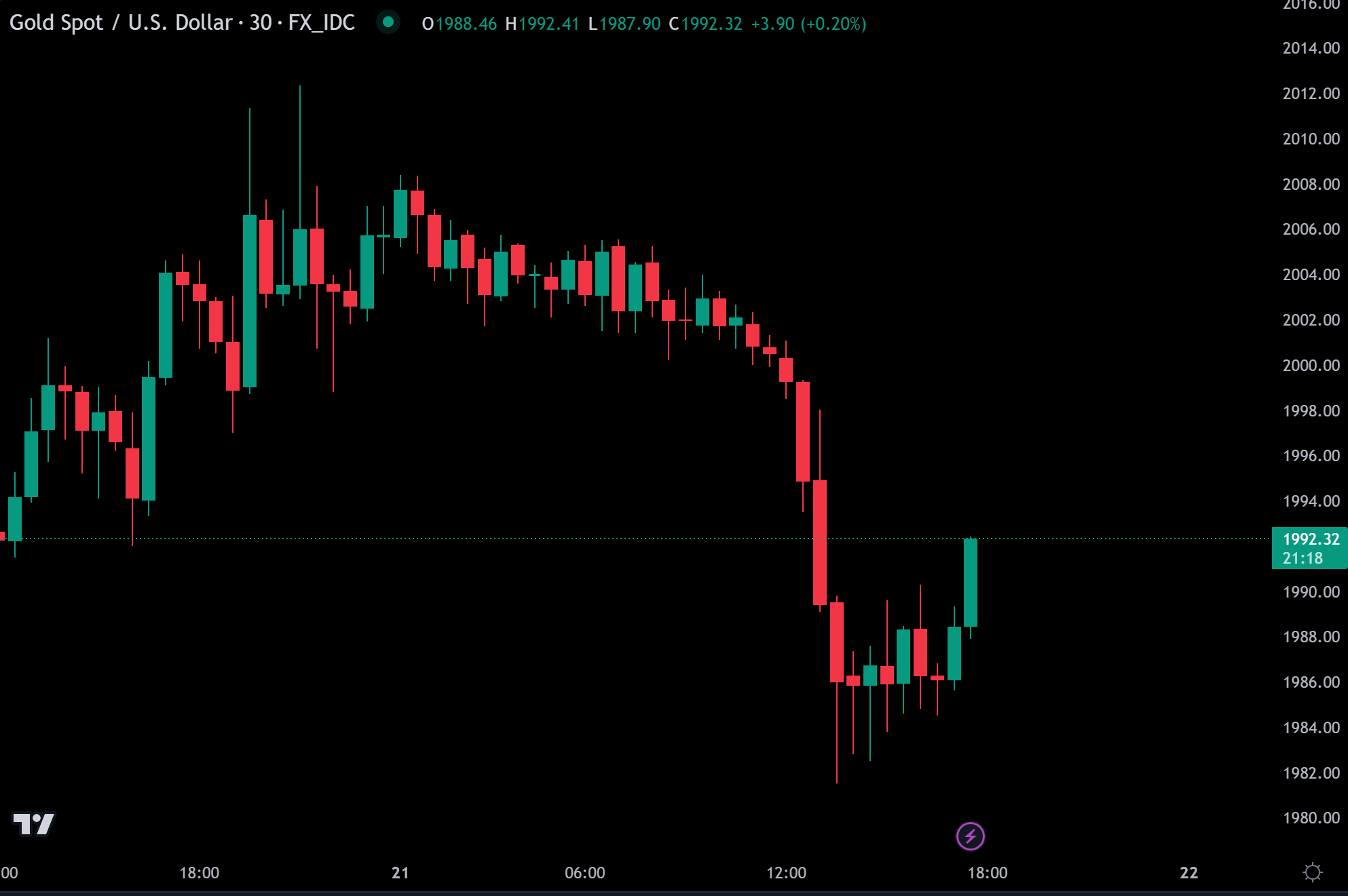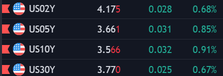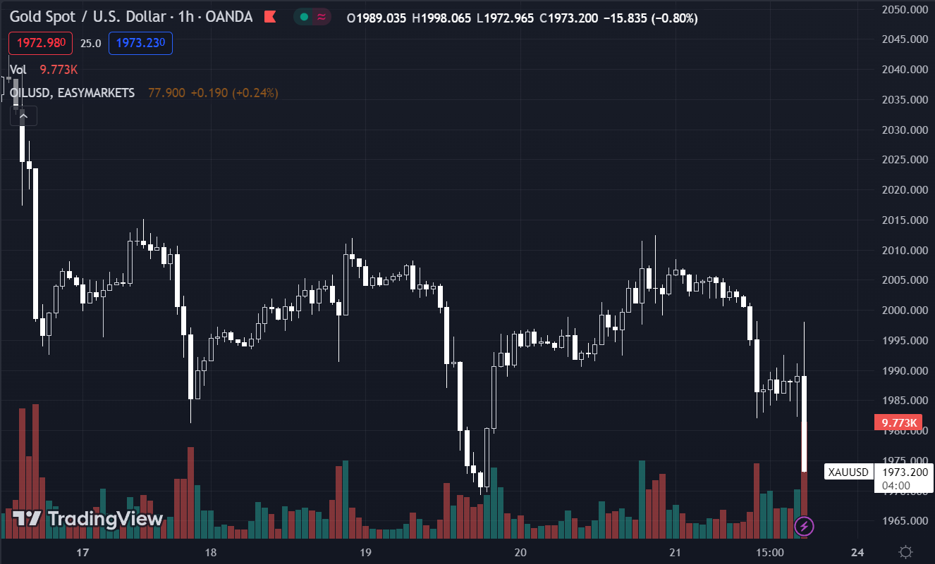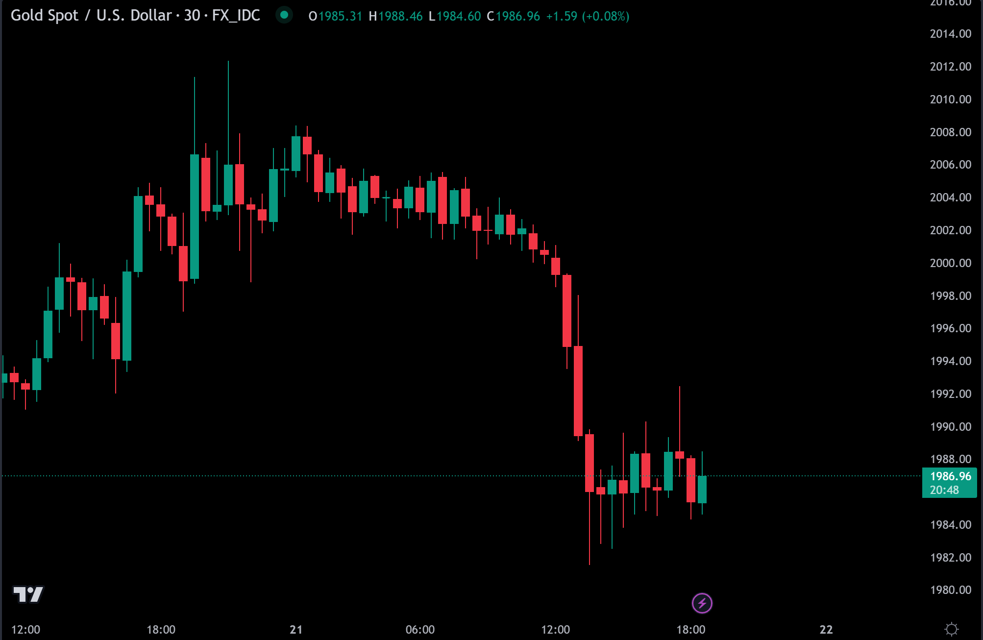 Lợi suất đồng loạt tăng đã tạo áp lực khiến vàng rơi xuống ngưỡng $1971/oz. Kết phiên, vàng đóng cửa giảm gần $22 xuống $1982.37/oz. Lợi suất 2 năm và 10 năm lần lượt tăng hơn 4bp lên 4.188% và 3.576%. Dầu thô chững lại sau 4 phiên giảm liên tiếp, tăng $0.5 xuống $77.87/thùng.