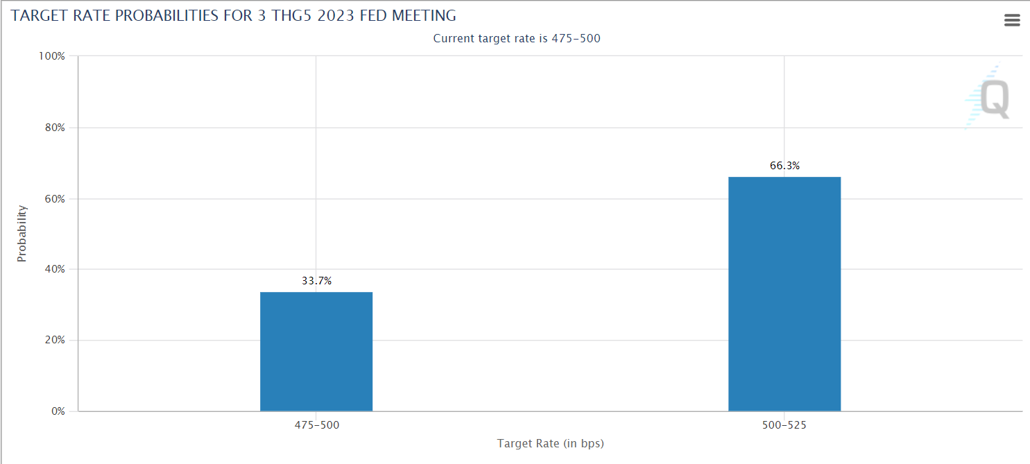 Báo cáo NFP được công bố thứ 6 tuần trước hỗ trợ cho khả năng Fed tăng lãi suất 25 bps. Thị trường hiện đang chờ đợi dữ liệu CPI Mỹ được công bố vào ngày 12/4. Dữ liệu này sẽ đóng một vai trò quan trọng trong việc xác định triển vọng sắp tới của Fed. Hiện tại, thị trường đang định giá khoảng 66% cho mức tăng lãi suất 25 bps.