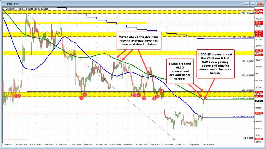 USD/CHF tăng vọt trong phiên, kiểm tra đường MA 200 giờ ở mức 0.91068. Đỉnh mới cũng chạm mức này. Giá sẽ tiếp tục hướng tới khu vực giao động của ngày 14 tháng 3 tại 0.9115 và 0.91264.
