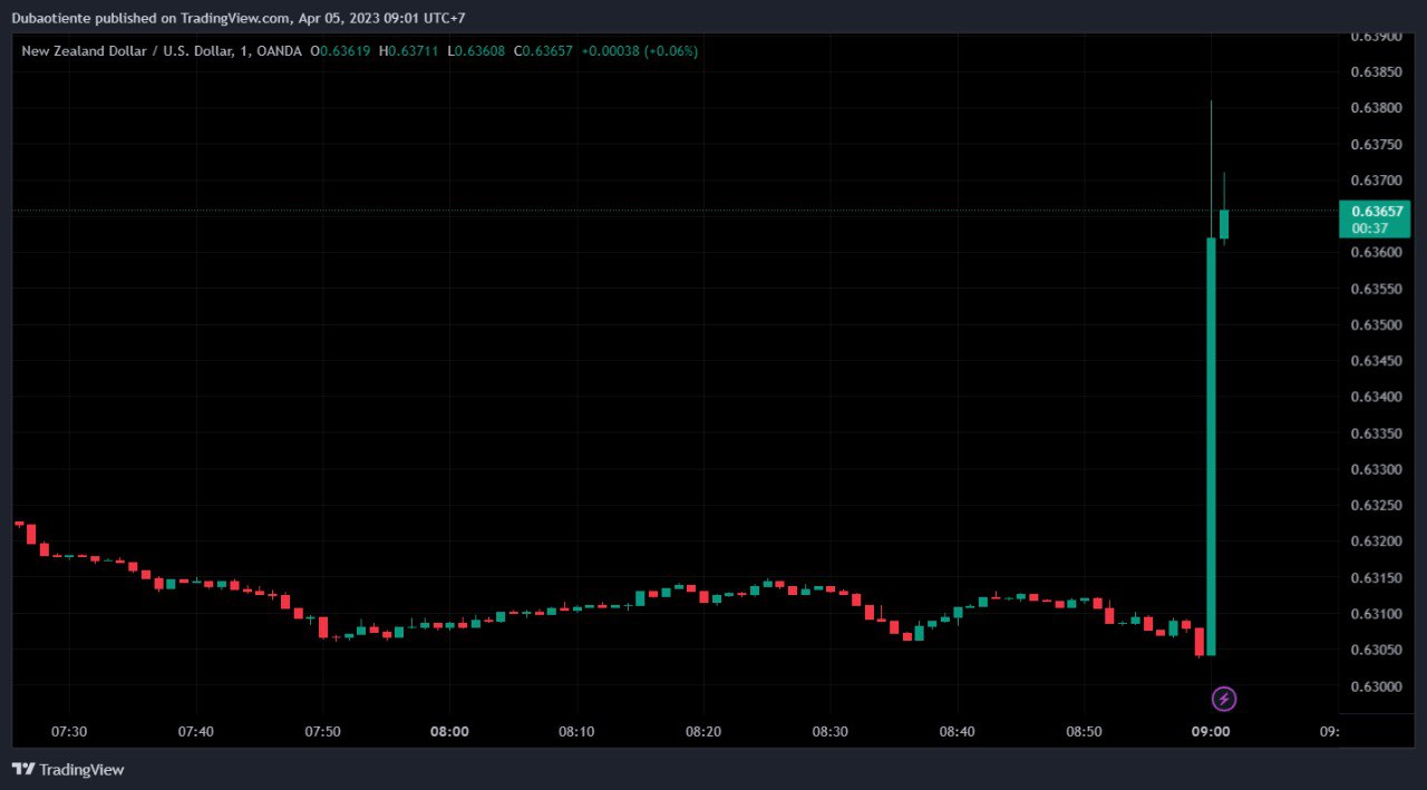 RBNZ tăng lãi suất 50bp từ 4.75% lên 5.25%, vượt xa so với kỳ vọng của thị trường. NZDUSD nhanh chóng phản ứng tích cực với thông báo này.