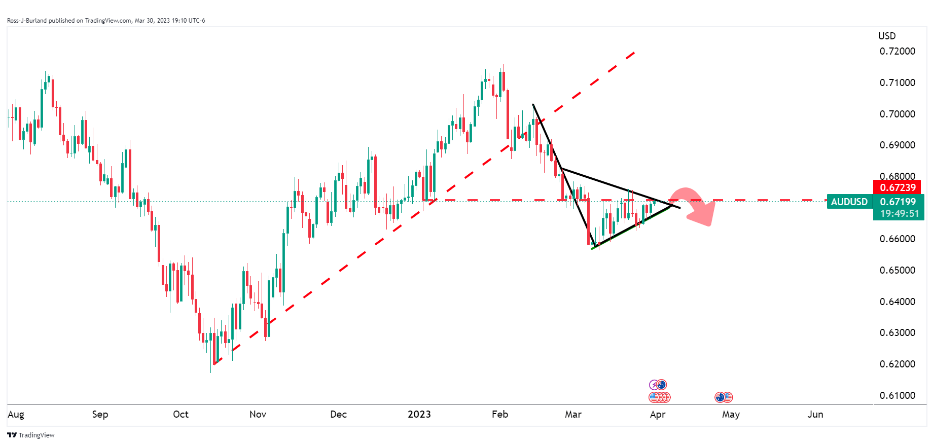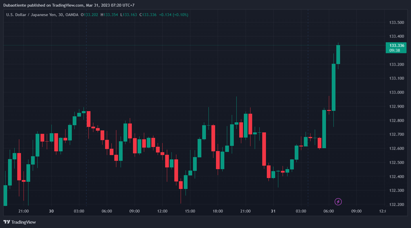 Trên thị trường FX, USD có một phiên giao dịch tồi tệ khi giảm mạnh trên diện rộng và yếu hơn so với tất cả các đồng tiền chính. NZD là đồng tiền tăng mạnh nhất so với USD, khoảng 38 pip. USD lao dốc từ giữa phiên Á và tiếp tục suy yếu mạnh sau các dữ liệu kinh tế không mấy khả quan. Đặc biệt là báo cáo GDP Q4/2022 thấp hơn so với kỳ vọng (2.6% so với dự báo 2.7%) và số đơn xin trợ cấp thất nghiệp tuần trước vượt kỳ vọng (198K so với dự báo 196K) khiến thị trường càng củng cố thêm nhận định Fed sẽ giảm lãi suất trong nửa cuối năm nay. Ở chiều ngược lại, chỉ số CPI sơ bộ tháng 3 của Đức vượt dự kiến (0.7% so với dự báo 0.8%) đã hỗ trợ EUR lên giá. Các traders EUR nhận định tuy CPI toàn phần tại khu vực đồng tiền chung châu Âu giảm nhưng CPI lõi vẫn ở mức cao. GBP kết phiên gần mức đỉnh trong ngày, mức cao nhất kể từ ngày 3/2 đến nay. Đà lên của CAD được thúc đẩy bởi sự suy yếu của USD và giá dầu tăng mạnh trong phiên.
